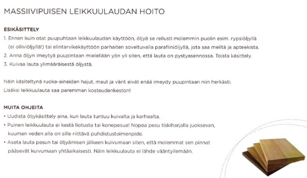 Puinen leikkuulauta on kestävä, veitsiystävällinen ja oikein hoidettuna hygieninen leikkuulauta. Puista leikkuulautaa voi käyttää molemmin puolin ja se on tukeva, sekä turvallinen leikkuulauta. Myös laadukkaat keittiöveitset pysyvät hyvässä kunnossa puisella laudalla leikatessa.