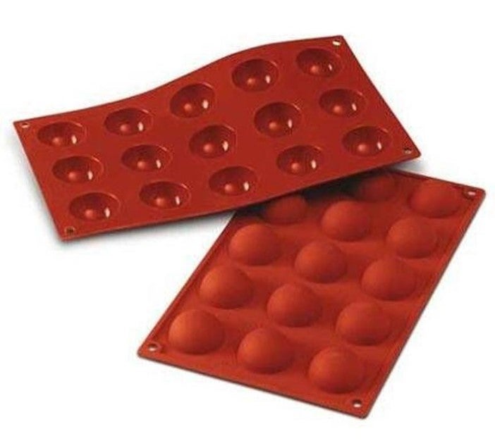 Silikoninen puolipallo muotti, jossa on 15 halkaisijaltaan 4 cm ja korkeudeltaan 2 cm reikää, yhden reiän tilavuus 20ml.