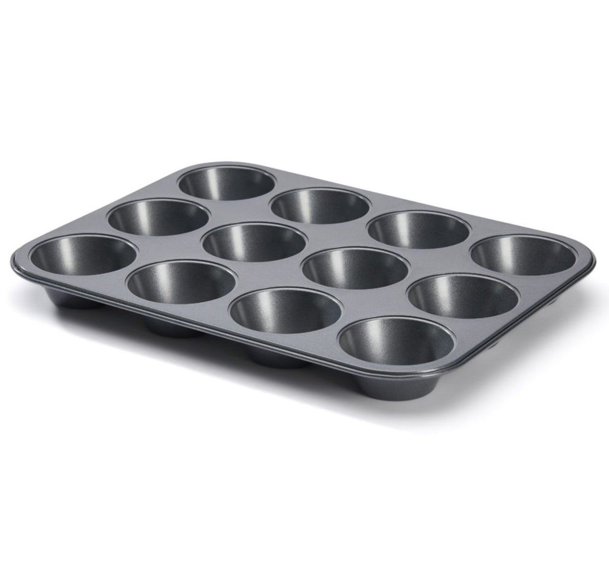 Teräksinen 12 reikäinen muffinssivuoka, jossa tarttuvuutta ehkäisevä pinnoite.