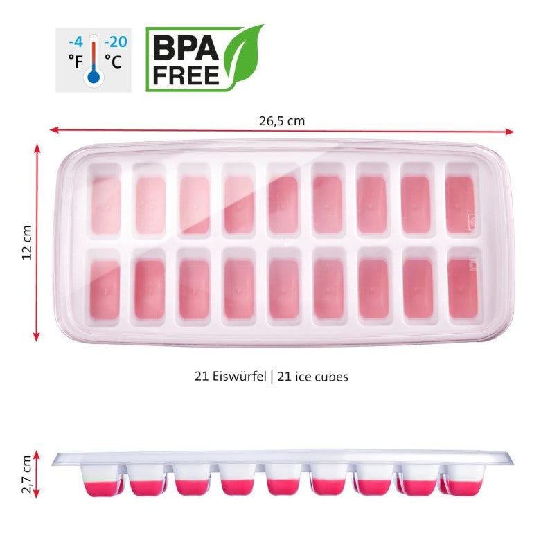 Jääpalan koko 4,5 x 2 cm x 18 kpl. Muotin mitat 26,5 x 12 x 2,7 cm. Pakkauksessa 2 kpl jääpalamuotteja kansilla. BPA-vapaa. Voi pestä astianpesukoneessa.
