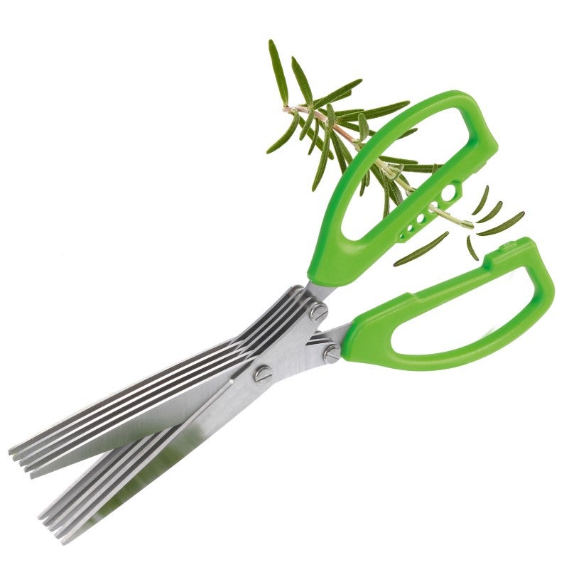 Kätevät viisiteräiset yrttisakset. Saksilla on helppoa ja nopeaa silputa tuoreita yrttejä suoraan annokseen, pataan tai salaatin päälle