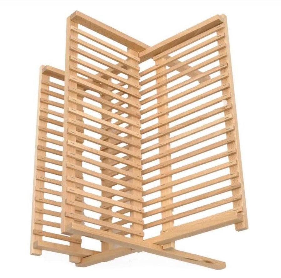 Tyylikäs pyökistä valmistettu kasaantaitettava astiateline, jonka vaalea luonnollinen väri sopii kauniisti jokaiseen keittiöön.