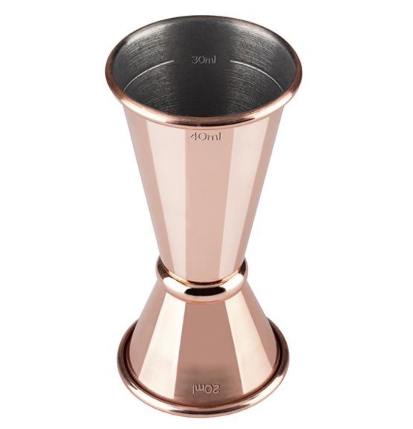 Teräksinen kuparoitu alkoholimitta jossa toisella puolella 2 cl ja toisella 4 cl mitat.